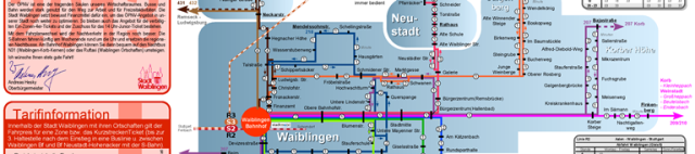 Der Fahrplanmerker hat zum Ziel, alle Buslinien im Waiblinger Stadtverkehr auf einem DIN-A-3-Blatt darzustellen. In handlicher Form ermöglicht der Plan allen Nutzern rasch den geeigneten Bus oder die geeignete Bahn herauszulesen.
