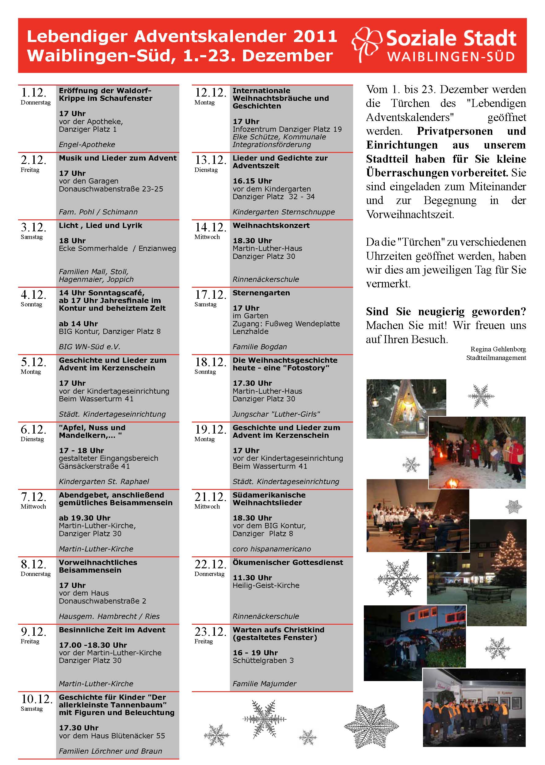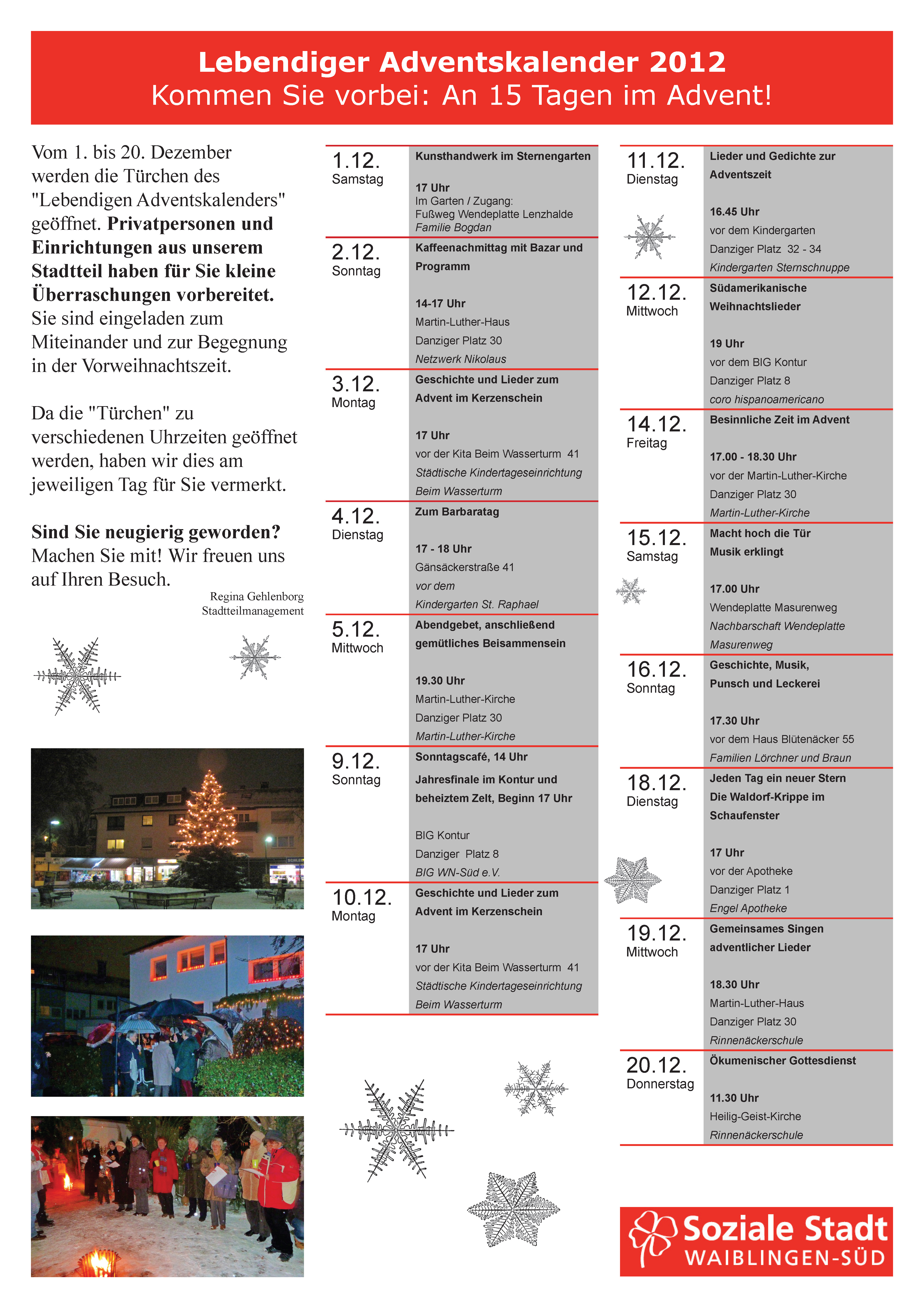 ![]() Für die Großansicht bitte auf das Titelbild klicken... [KORREKTUR: Die Veranstaltungen am 13. und 20. Dez. vor dem Kindergarten Beim Wasserturm 41 finden bereits um 17 Uhr statt] |